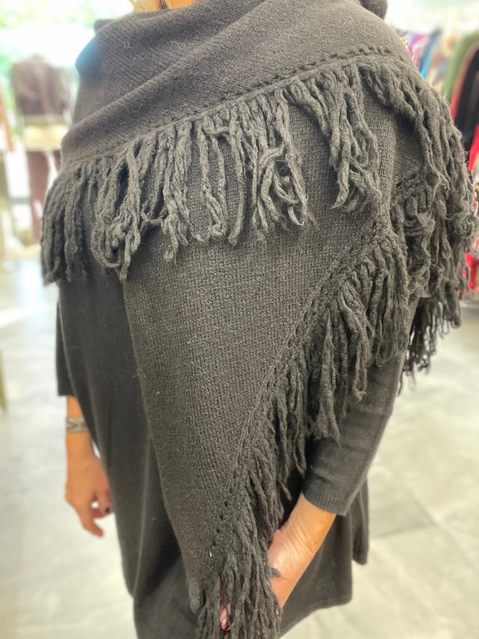 Poncho de lana en forma de pico. Ribeteado en flecos.