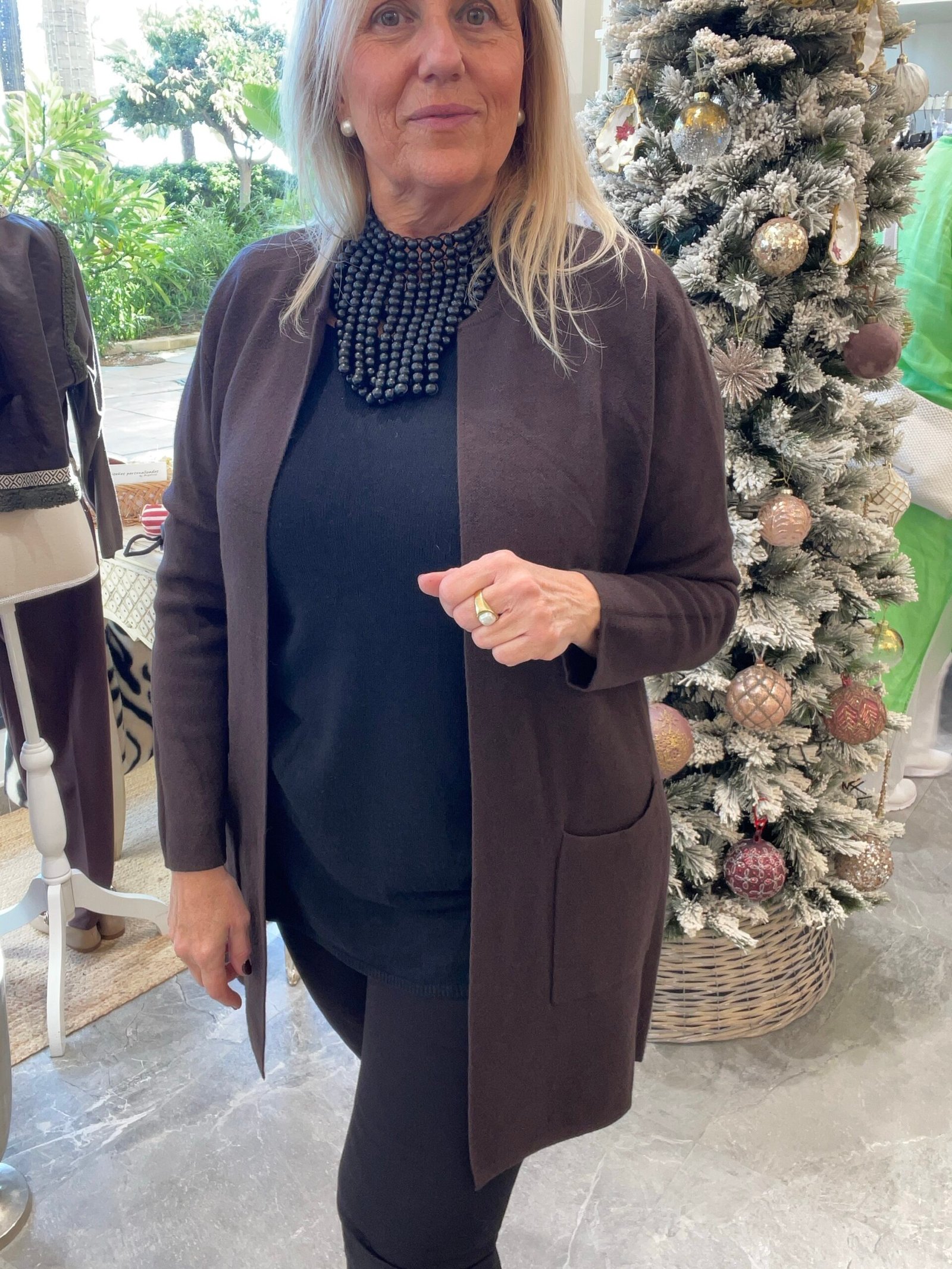 Rebeca punto. Lleva bolsillos y largo por encima de la rodilla. Abierta al tope sin botones.